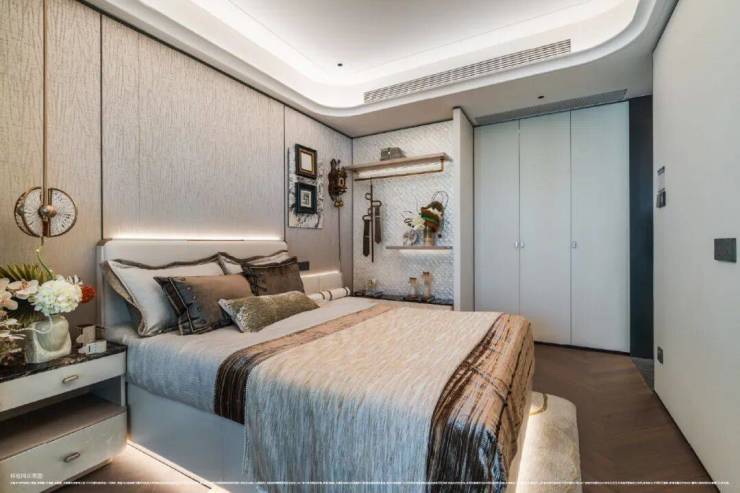 卧室则铺设海派鱼骨拼花地板,借木质肌理的温润与细腻,营造出私密领域的宁静氛围。这种“公区显质感、私域藏温度”的材质分区逻辑,恰是高端住宅设计中至关重要的一笔。