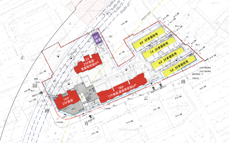 西侧为17-25层高层住宅,东侧为4栋3层联排。