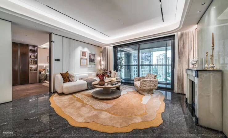 在豪宅的配置之外,精装细节亦追求极致:公共区域选用80×80cm的大理石通铺,以整面石材的厚重质感彰显空间格调,同时采用无缝拼接工艺,显著降低了日常清洁的难度。