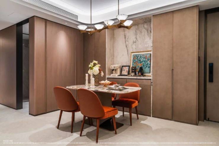 客餐厅一体化,外接南向大面积观景阳台,整个公区视野开阔,尺度阔绰。