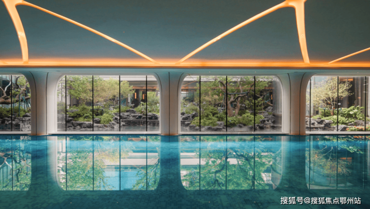 约500㎡艺术馆般泳池,天花、墙面以现代摩登的手法,抽取上海海派建筑造型为元素,打造充满静奢韵律的造型,搭配泳道尽端景泰蓝奢石背景墙,勾勒出一处臻享静美的精神之所。