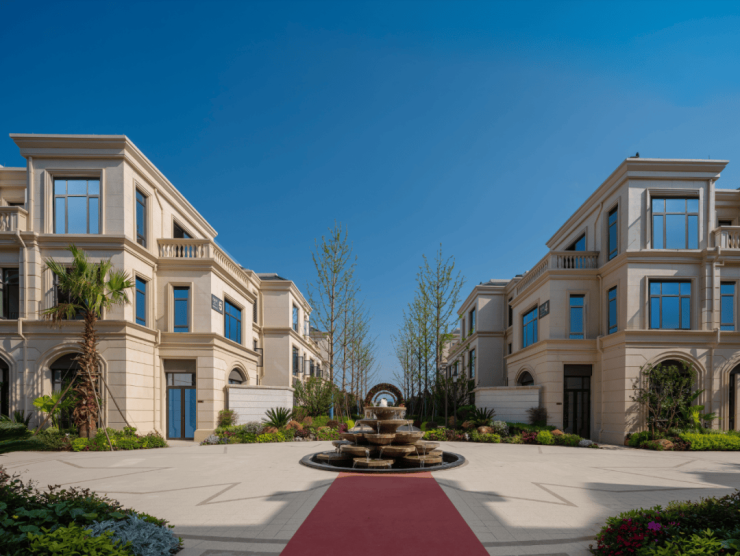 以罗马大道为墅区中心景观交流轴线,从南至北,路旁林荫树阵林立,景观水法、花钵花台和休憩空间与两旁的法式建筑风格相得益彰。