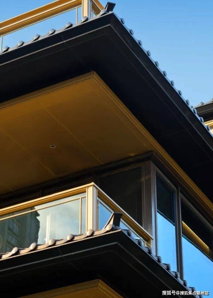 三重屋檐,代表天地人融合的东方宫殿最高等级,上檐、外檐、下檐三重结构,现代立面,以铝板、格栅、石材、瓦墙型材、玻璃等现代型材,彰显传世之宅的独特气度。