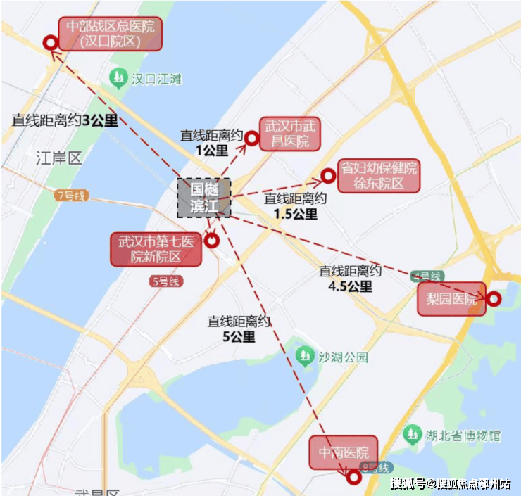 「三甲护航 呵护健康生活」项目5-10分钟车程内拥有包含 中南医院、梨园医院、中部战区总医院、湖北省妇幼保健院、武昌医院等多个三甲医院,项目南边不远就是在建的 七医院新院区,目前已经封顶,建成后业主看病就医也比较方便。