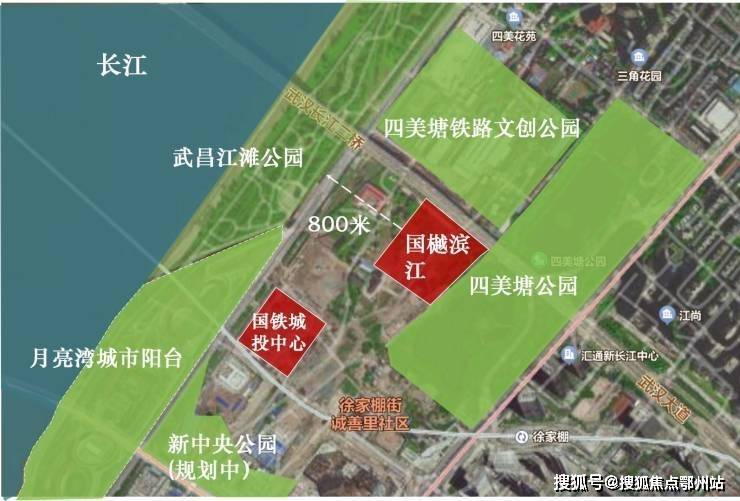 「一江一湖五园,武昌滨江生态绿核」项目位于长江畔,背靠四美塘,有月亮湾城市阳台、四美塘公园、四美塘铁路文创公园、武昌江滩公园、新中央公园(规划)等五园环绕,人文生态体系景色宜人,天然城市氧吧,生态宜居。