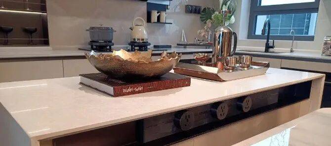 厨房额外标配带 有收纳柜体的岛台空间,轨道式插座同样是交付标准,厨房台面是和内环某10万+项目同款材料: