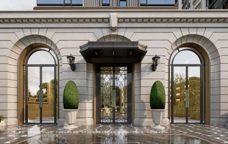 高层与洋房承袭外滩经典建筑的“横纵三段式” 结构,由下至上的力量感,树立起极具辨识度的优雅姿态。别墅则甄取华盛里石库门的过街楼、老虎窗、立面腰线等元素,以大面积石材与金属细节点缀,实现历史符号的当代奢华表达。
