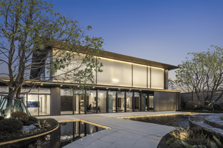 建筑美学: 建筑方面,汲取高级灰经典美学灵感,采用珍珠蓝石材、多彩仿石漆、深灰色铝板搭配宽幕玻璃,打造出玻璃流幕现代立面,简洁大气又不失时尚质感,彰显出永恒的建筑魅力,历久弥新。