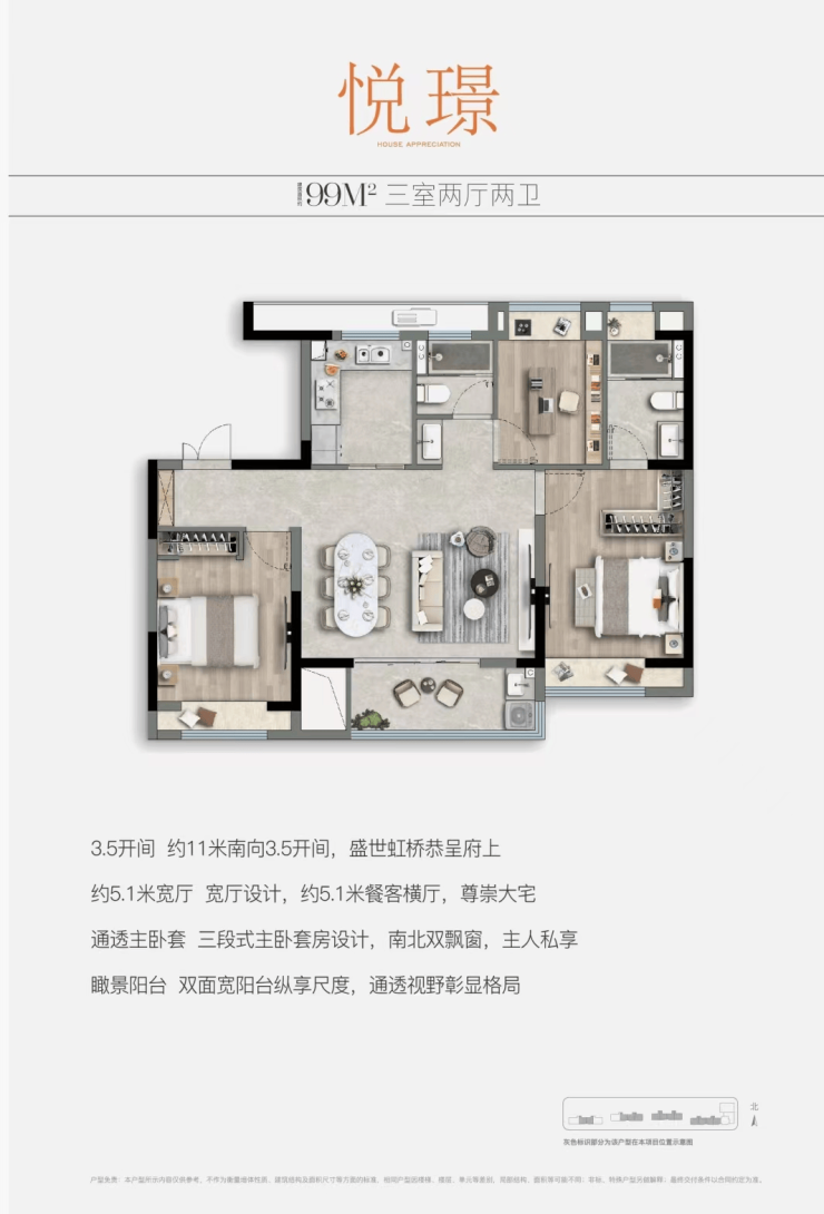 户型点评:百平左右的户型打造三室很常见,但能同时做到南向3.5开间属实难得;餐客横厅更是达到了约5.1米的宽度设计,大幅提升了生活舒适度、以及实用性;