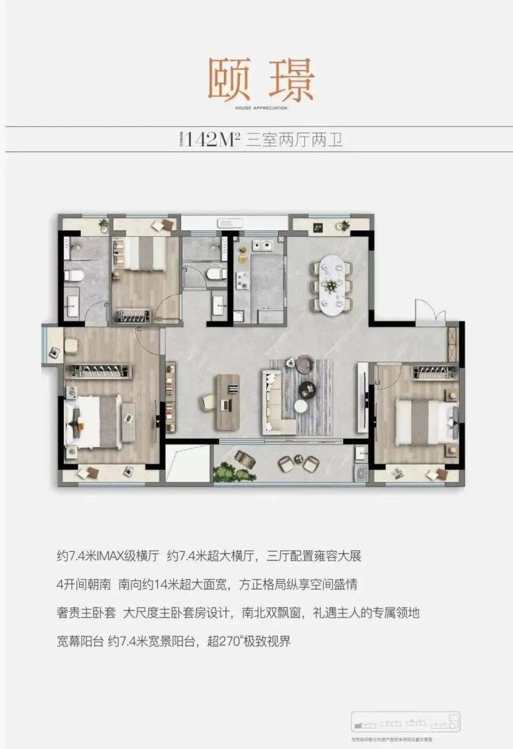 户型点评:两条天然河道从中建颐璟臺北侧和西侧蜿蜒流过,而140平这个户型最大的特点就是增加西侧开窗设计,整个房型三面采光,不但提升房间采光通风,更能完美拥有西侧北侧双河视野,一线河景尽收眼底。
