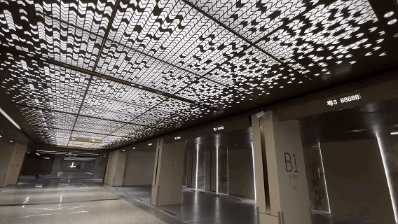 悦府二期对奢华的诠释甚至延伸至 地下空间。地下车库入口两侧墙身与顶面采用高品质流星造型金属板,地库玄关配以意大利产的普拉达蛇纹绿奢石,星空顶蓬设计让每一次归家都仿佛开启星空之旅。