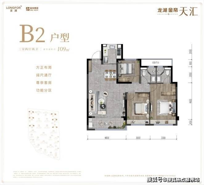 建面约109㎡的三室两厅两卫边套户型,拥有约4.8米面宽的客厅