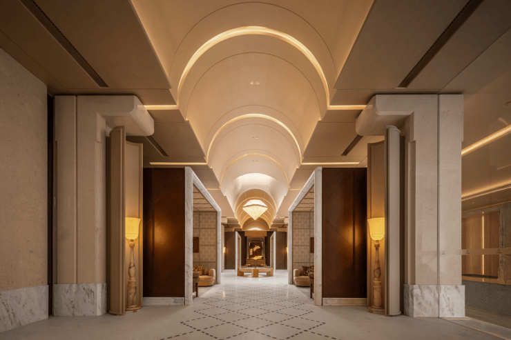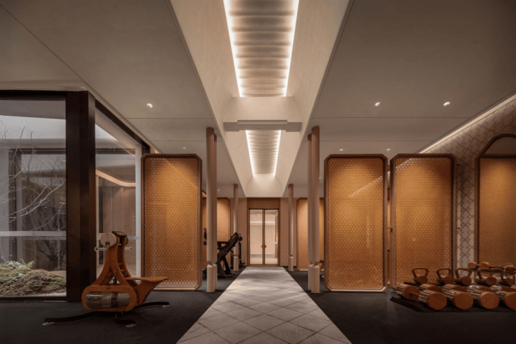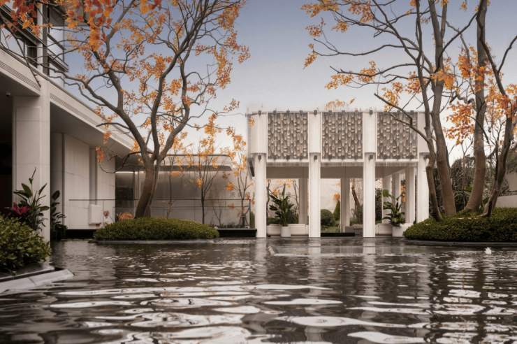 月光米黄石材门庭,经“揉石成缎”技艺赋予石材流动感,搭配玫瑰酒店同款非遗门牌,赋予归家第一重仪式感;超千方镜面主题水院,倒映天光云影与三株原生乌桕风姿,与社区外的水岸意境连贯呼应;