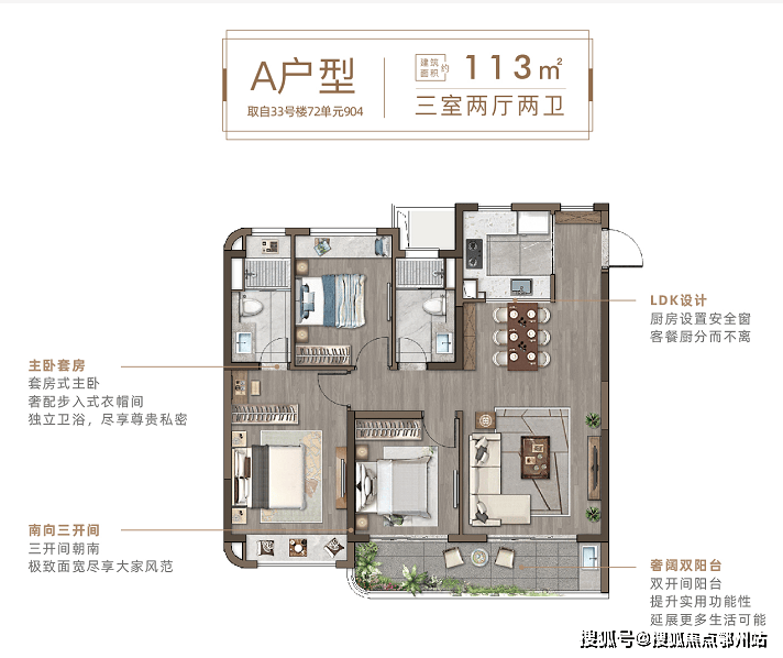 主卧套房设计,建面约99㎡、113㎡主卧套房带独立卫浴、宽大衣橱空间让衣物分类放置、收纳自如,独立卫浴,静享二人世界私密时光,尽情拥抱惬意、舒适的精致生活。
