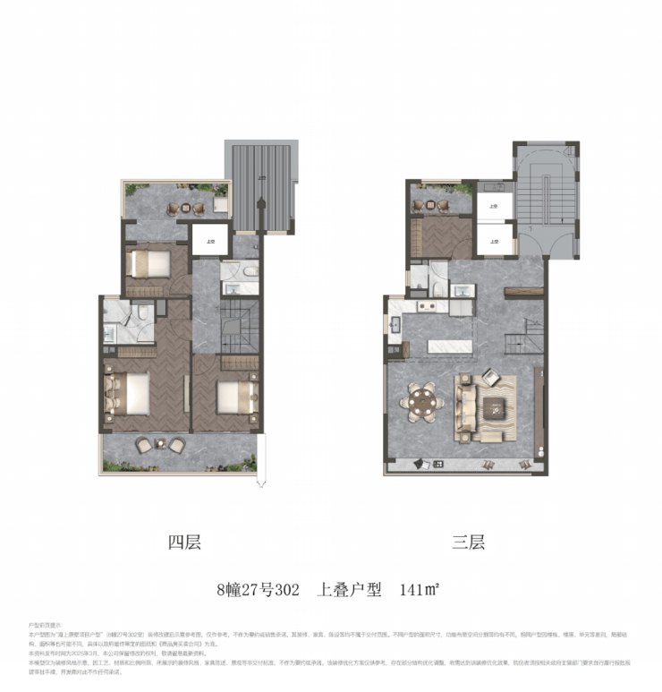 项目叠墅包含建面约141㎡上叠和建面约150㎡下叠.