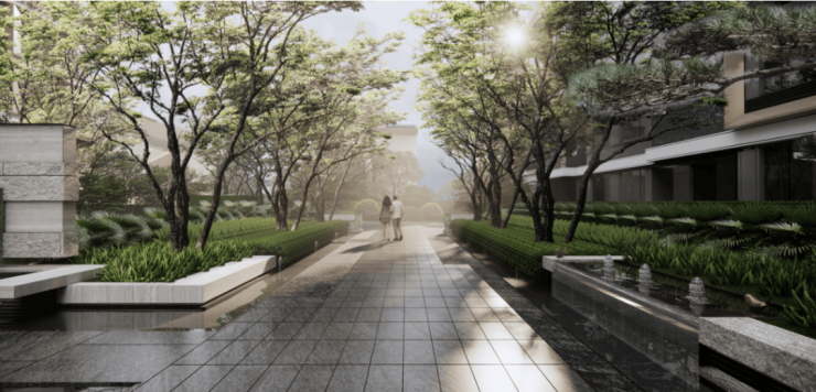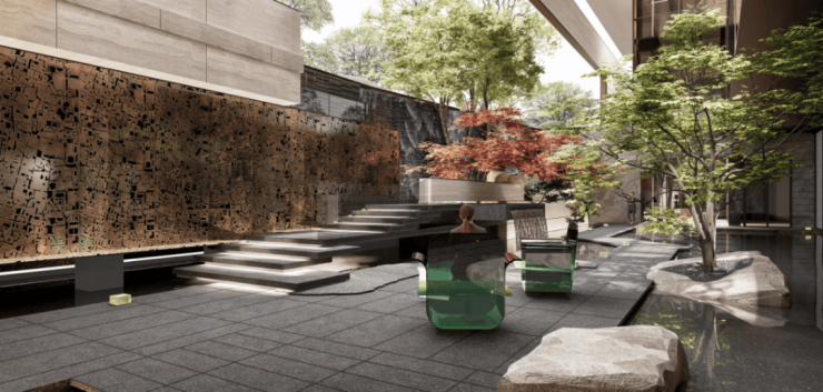 大堂通往墅区的路径中引入了「雾森系统」,是在复现《村庄雨霁》诗句中的庭院深深烟雨朦胧的唯美意境。