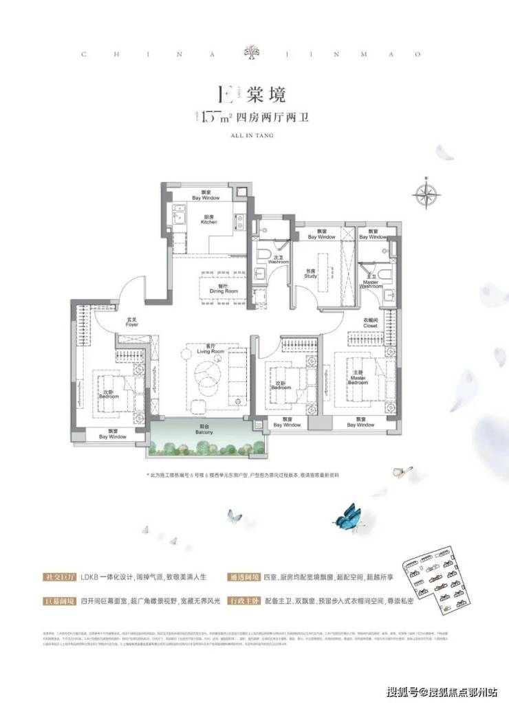 建面约137、152㎡4房2厅2卫,空间布局非常相似,都做到了 四开间朝南+入户玄关+6飘窗+主卧套房设计,所有空间的尺度一步到位。