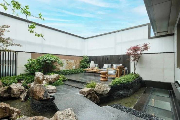 北区配备约3000㎡酒店式会所花园,地下会所承载艺术展示与社交功能;南区通过自然山水的礼序山石园林步入约1500㎡地上泛会所花园区。设计汲取古代文人雅士隐逸山林的空间意象,融入山、泉、林、台、石等元素,巧妙结合书院文化内涵与自然意境,营造富有东方哲思的景观体验。