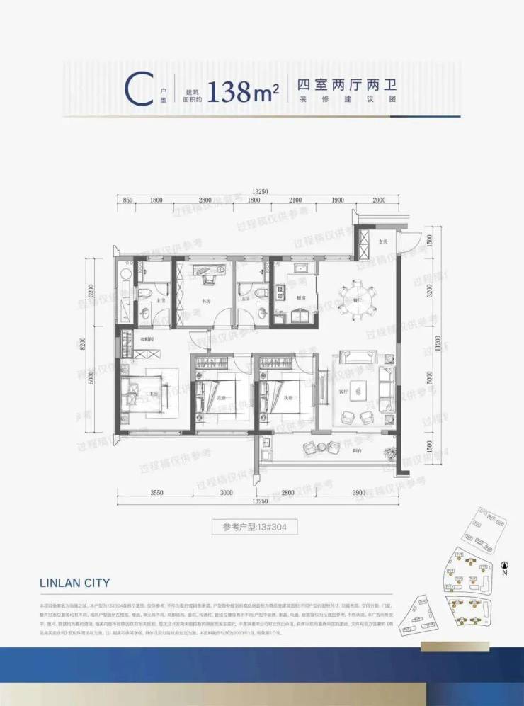 建面约138方户型: 138㎡四房两厅两卫边套户型,则适合改善家庭的需求。空间格局动静分区,三个南向卧室,做到了「阳光平权」。卧室与客厅一同实现了四开间朝南,南向面宽超13米,同样也规划有双开间的「跑道阳台」。