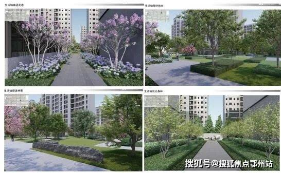 例如,从社区北门而入,进入生活轴。生活轴打造了四大景观节点,幽语花香、翠林拾光、碧波林影、悦光森林,有花草组合树阵的繁花似锦,有硬朗风格的灌木点缀,也有波浪形草坪、散落的石头、自由生长的树木……将生活与自然紧密相连。