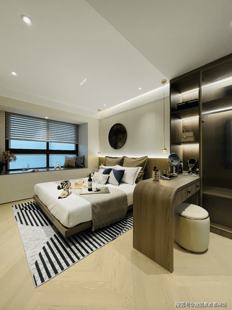 建筑立面造型现代简洁, 通过简明线条塑造现代时尚与潮流经典合一的建筑语汇,为城市景观呈现了一种独特的都市建筑审美符号。横向线条刻画建筑的形体关系,辅以精致的细节来彰显建筑的品质。材料主打象牙白,以浅色为主调,咖啡色为辅调交相搭配,坚持纯粹和独特。流光溢彩的金色格栅顶,则让建筑更显恢宏大气,打造出富于节奏与质感的建筑形象。