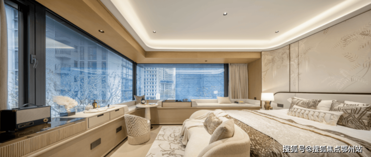 主卧拥有270度环幕飘窗,视野和采光优越,配备了高奢卫生间,空间感、尊崇感拉到顶格。
