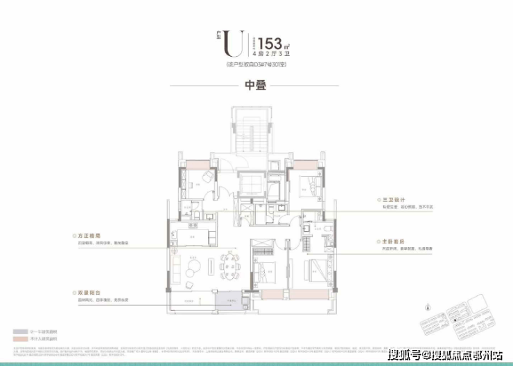 中平户型以四开间朝南的IMAX级采光面,打造出堪比市区豪宅的尺度感。4房4飘窗2阳台的设计,配合双套房布局,一共有三个套房,让每个家庭成员都享有独立私密空间。