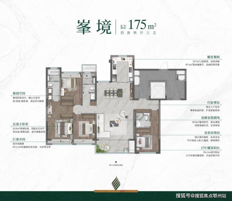 终改户型185㎡压缩至175㎡,配比减少2%。终改户型与观萃相比,进深更长,取消了餐厅的飘窗设计,优化了次主卧与入户动线的对视问题。