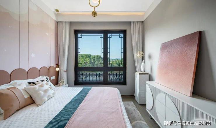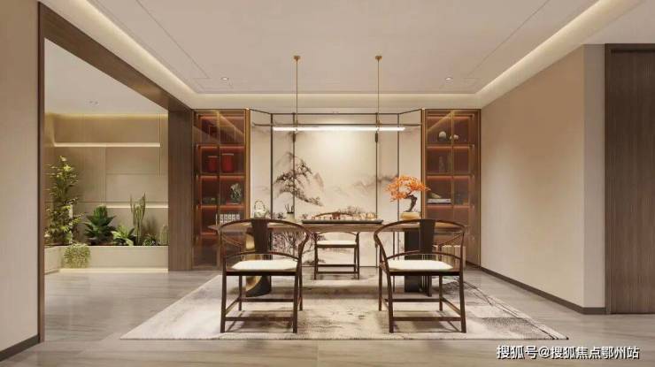 以建面约144㎡中式合院样板房为例,南向面宽约9.9米,餐客横厅开间约6.6米,尺度阔绰,餐客厅和一楼老人房都可以一步庭院。二楼为双套房、开放式书房,主卧套房带大露台,揽胜风景,观星赏月,视野开阔。