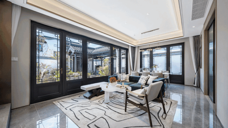 打造移步换景的江南园林雅境, 呈现“堂、巷、院、宅”四进式礼序院落。,将千年东方礼序融于一院。结合框景、对景、漏景等丰富的造景设计,营造“移步换景、如在画中”之感,汇集杭州桃李春风、安吉天使小镇等蓝城经典中式合院营造经验之大成,专为当代名人雅士打造有天有地有花园的江南院落生活。