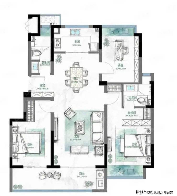 99平和117平高层的户型非常方正,都是开间朝南、双阳台的设计,空间尺度更加顺应改善群体的需求。