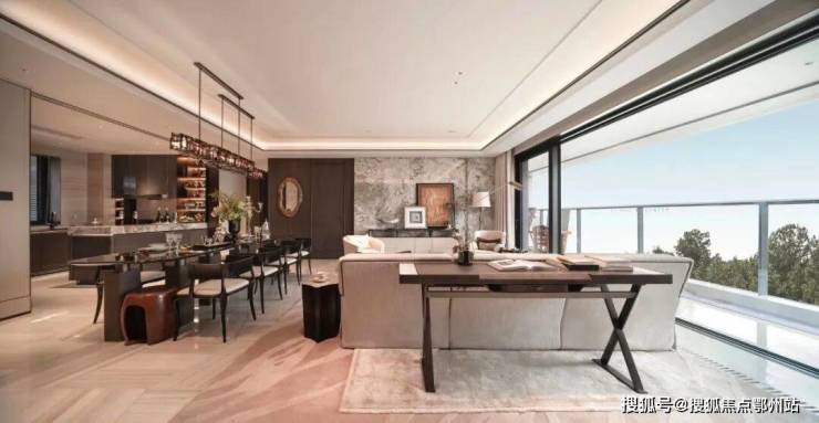 其次是建筑采用经典的三段式立面,集合仿石铝板、三玻两腔LOW-E玻璃和香槟色铝板线条,形成方正有序的 框感 ,既有超奢美学,也把每一户的居住领地感拉到极致。