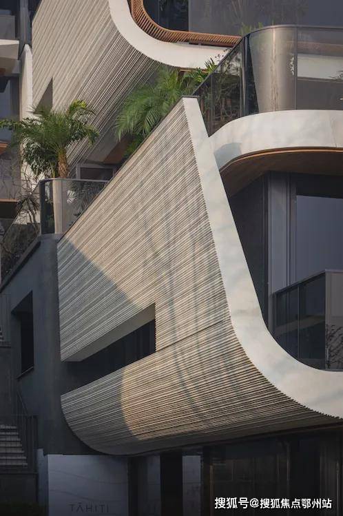 塔希提设计意向取自建筑之父柯布西耶的“朗香教堂”,为还原塔希提主题的“神秘、自然、松弛”效果,外立面材质采用HPC高性能装饰混凝土系统、热木纹转印铝板及格栅、高端隐私玻璃、系统门窗等,营造出独特的高级质感。