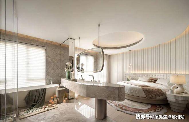 追求室内外空间渗透,奢享极致自然景观资源,以约190㎡花园平墅高定样板间为例。客厅外连270°环幕阳台,长约21米,阳台面积近33㎡,最宽处可达约3.1米。