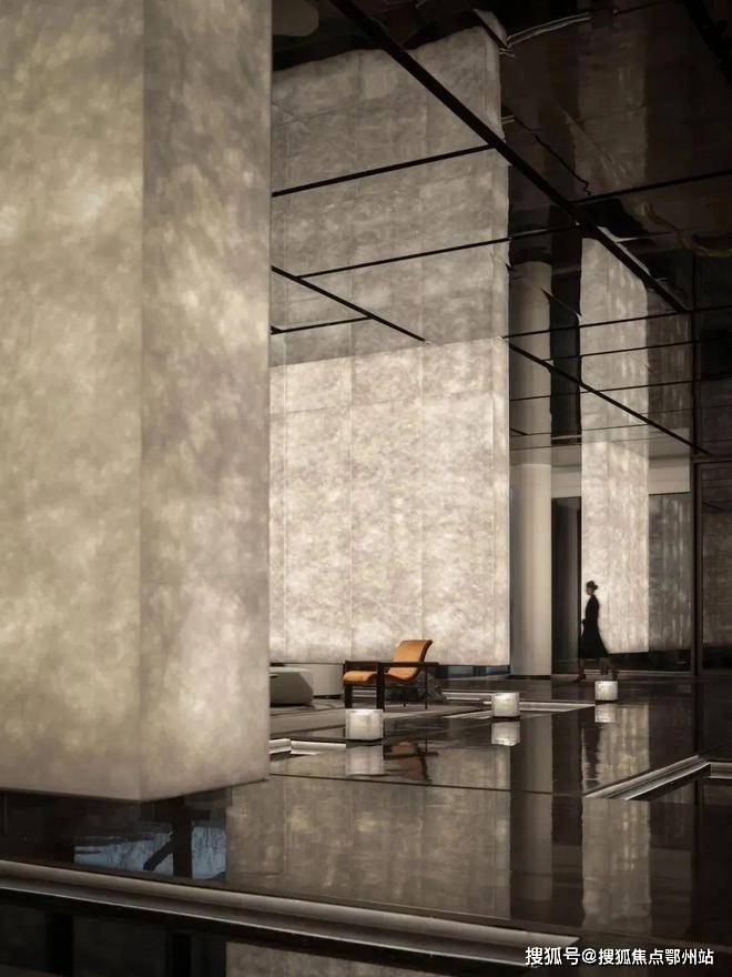 结合宋代山水画,设计将溪谷的概念同样贯穿在大堂景观的设计中,镜面般的水景波光粼粼,与黑色景石相映成趣,灰色墙面沉稳雅致,木质格栅则添上一抹温润的自然风情,融合了现代质感与隐逸于都市繁华之中的风情。