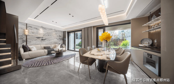 汽车坡道采用氛围照明,搭配星空顶造型彰显独特。玄关空间以线条灯光、地面环氧磨石、星空顶及柱面石材等,提升业主归家仪式感及空间品质感。