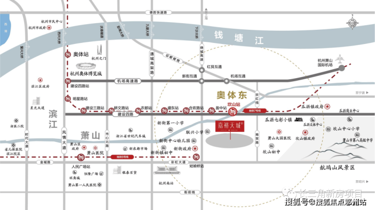 地铁13号线(规划)从奥体及市中心穿越而来,距本项目最近坎山站出发9站可直达奥体,2站可达萧山国际机场、机场高铁站,一刻即达滨江。