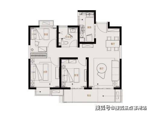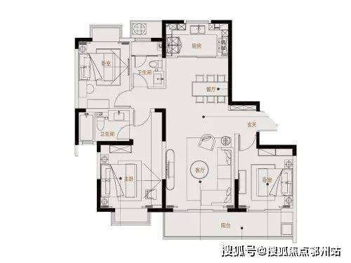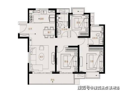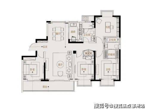 116平:三房两厅两卫,和98平相比,每个功能区的空间都要大一些。除了贯通阳台的卧室,南向主卧和北向次卧都做了飘窗,空间性价比略高于98平。