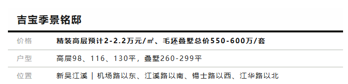 项目吸引我的主要有两大亮点, 一个是开发商的实力。据我了解,吉宝季景铭邸所在地块是开发商全资拿地,这在无锡还是很少见的。