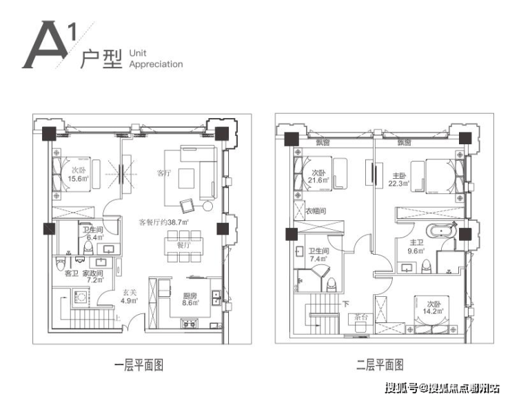 A1户型:180度全景采光,超大尺度一体客餐厅,奢阔主卧。