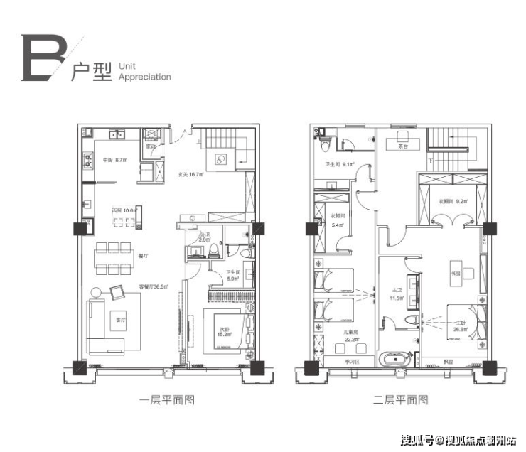 B户型:客餐厅一体,主卧带书房,中西厨,大衣帽间