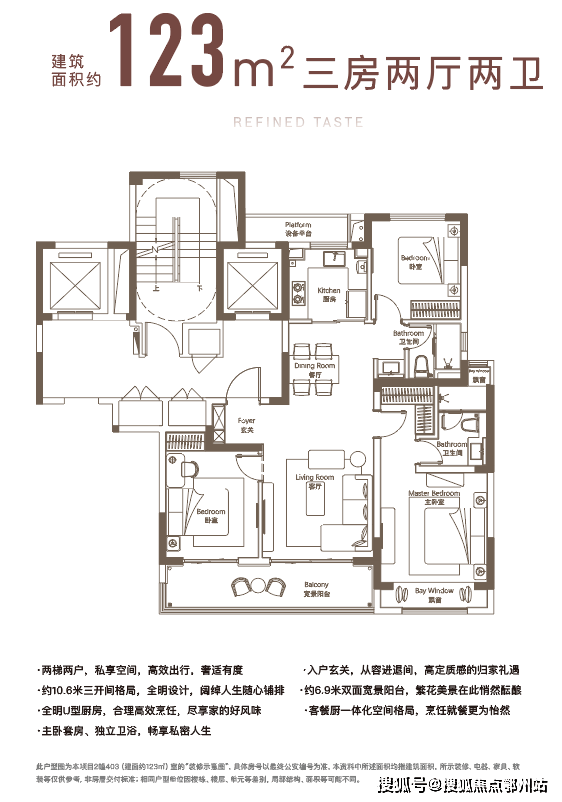 建面约123㎡户型,三开间朝南,约6.9米双面宽景阳台,主卧套房设计,匹配独立卫浴。