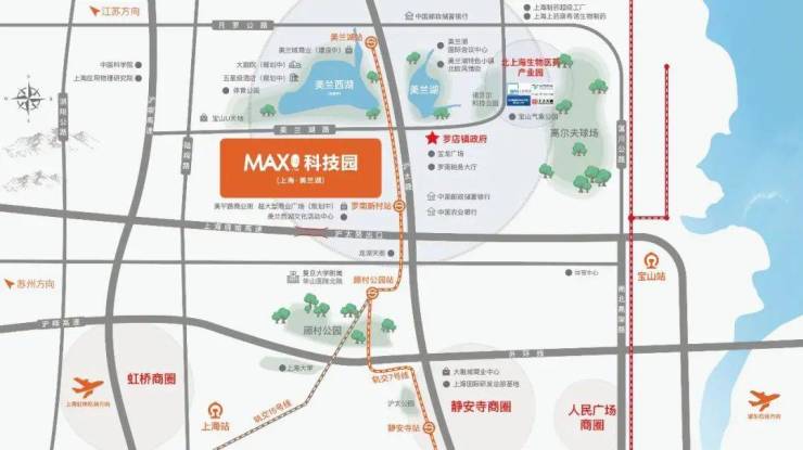 MAX科技园(上海·美兰湖)地处宝山科创中心主阵地,经上海绕城高速可直抵宝山站,未来随着板块内高铁、地铁19号线(在建)与沪崇高速的立体路网贯通,将形成“黄金十字”交通骨架,无缝链接上海主城区、长三角城市群资源,入园企业将获得更高效的人才流动、更广阔的腹地市场以及更强劲的产业链协同动能。