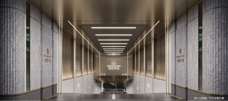 大堂入口取意于上海半岛酒店抬首即见的星河璀璨, 灵动光影点缀归家的路。地库入口的一抹“普拉达绿”和顶部透光仿云石顶设计,如同时光的礼赞,迎接每一位业主的归来。