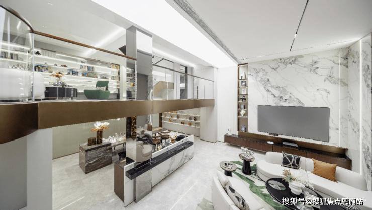 以及对空间节奏的把控!沿梯下行楼梯利用灯光,呈现出轻盈的悬浮感,夹层作为阅读空间延续了整体色调,在黑白之中求得平衡 不张扬 也不喧闹,弧形沙发和圆形茶几带来的包围感!