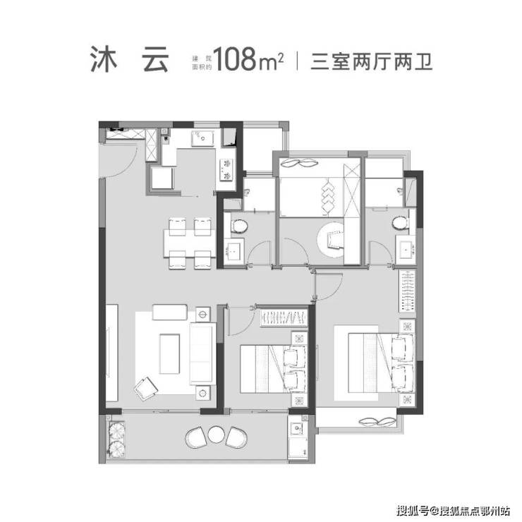 该户型,建筑面积约108㎡,整体方正,南北通透,为大三房设计。主卧为套房设计,加双次卧,双卫生间,居住舒适度更高。