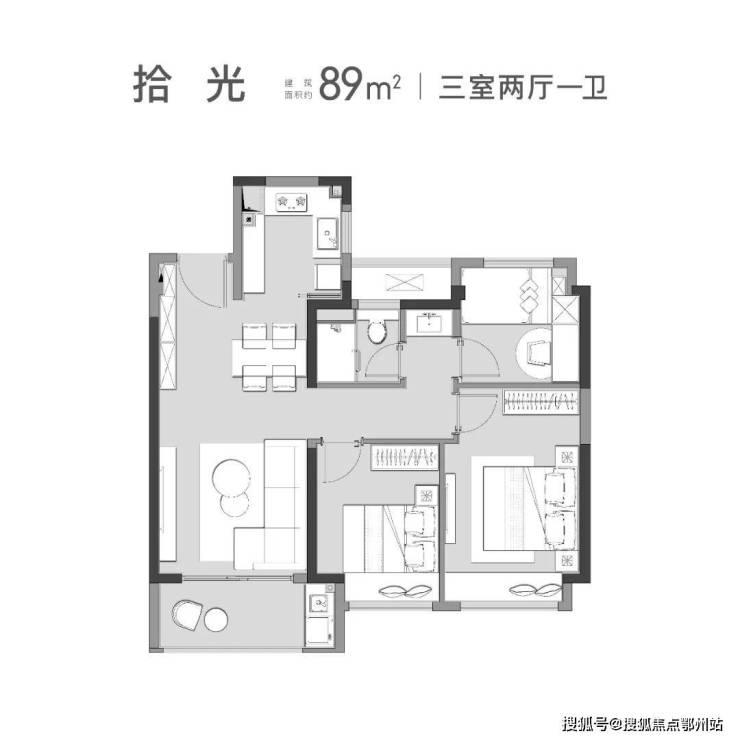 该户型建筑面积约89㎡,为三房两厅一卫一厨设计,整体户型方正,动静分区,作为子女婚房、或一孩家庭,都是比较合适的。