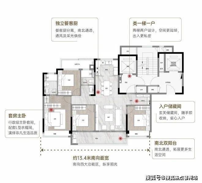 2T2户设计,带入户电梯厅。私享墅级入户体验约13.4m超大面宽采光,餐、客、厨一体化竖厅设计,更享三居室朝南。一孩家庭,兼顾父母与孩子惬意舒居;二孩家庭,阳光平权,俯瞰园林景观,同享自然风光。