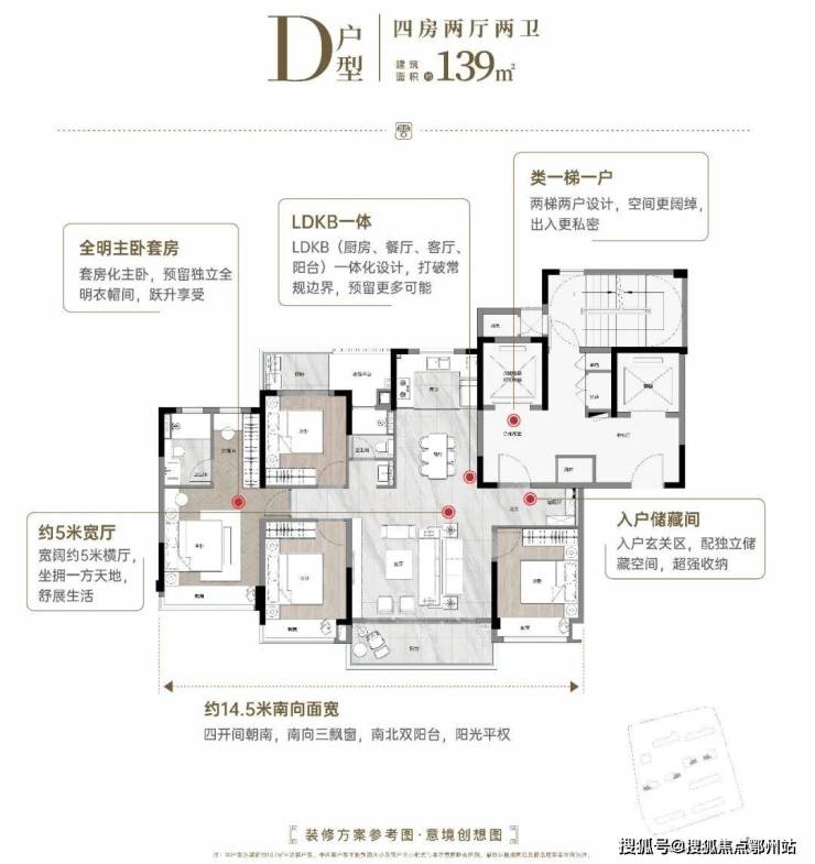 建面139㎡户型,客厅超5米的南向四面宽,大开间短进深设计,主卧带L型转角飘窗,独立全明衣帽间,尊贵感强。建面约160㎡户型南向超15m,四房三卫格局,L型步入衣帽间,更好的私密感。