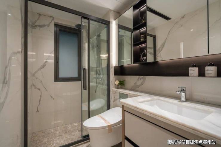 主卫:酒店式壁挂智能马桶、线条式暖风机、汉斯格雅花洒+顶喷、自带加热除雾功能的通长镜柜、天然大理石台面。